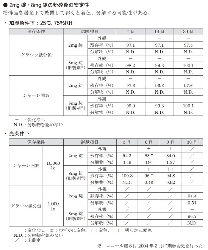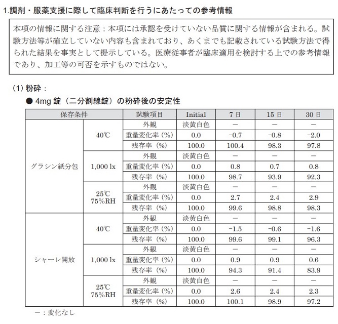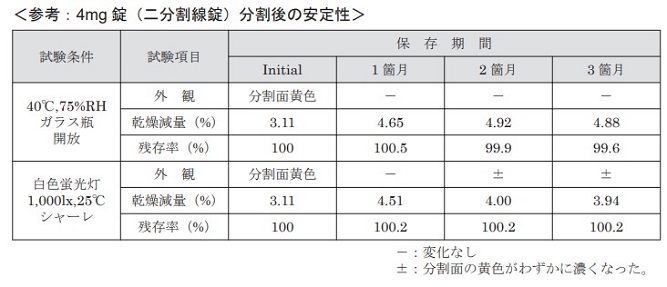 14.1 薬剤調製時の注意 〈錠4mg、錠8mg〉 14.1.1 錠剤半切機には適用できないことがある。均等に二分割できない場合がある。2025年10月更新