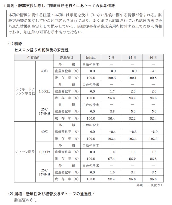 ヒスロン錠5を粉砕(半割)したときの安定性、崩壊・懸濁性及び経管投与チューブの通過性に関するデータはありますか?
