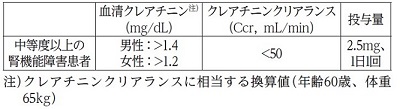 中等度以上の腎機能障害患者では、排泄の遅延により本剤の血中濃度が上昇するため、2.5mgに減量すること。