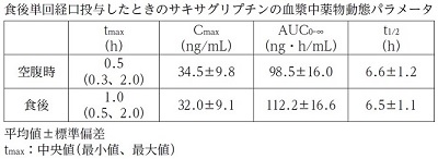 健康成人(25例)に本剤5mgを食後に単回投与したとき、空腹時と比較して、サキサグリプチンのCmaxは7.7%減少し、AUC∞は14.0%増加した。