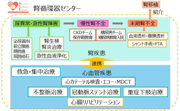 近年は合併症予防にも注力しており、特に循環器内科との緊密な連携を目的に腎循環器センターを立ち上げた(図3)。「腎臓病の患者さんは動脈硬化が進行しやすいうえに、透析になると体液管理の側面からも心臓病を併存しやすくなります。"心腎連関"という言葉があるように、循環器分野に非常に関わりの深い疾患ですので、以前から循環器内科とは連携しながら診療を進めてきました。このような連携体制があることは患者さんにとっても安心でメリットがとても大きいと感じています」と河合医師は説明する。